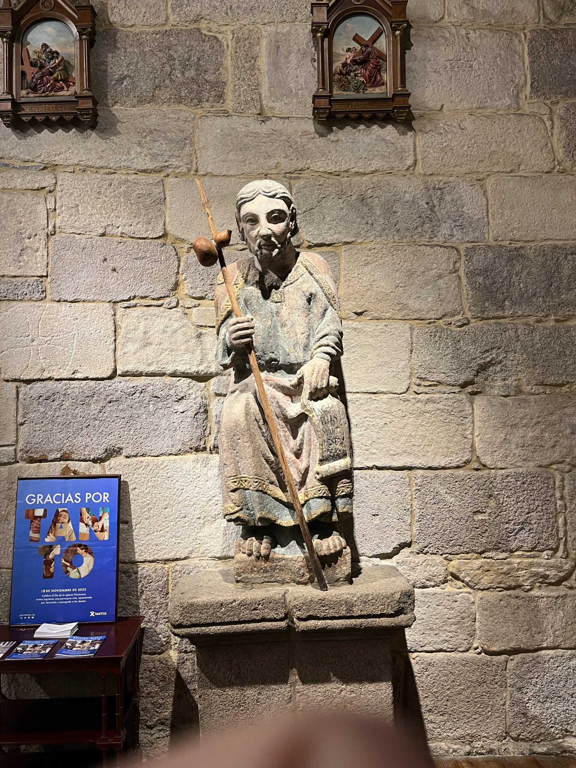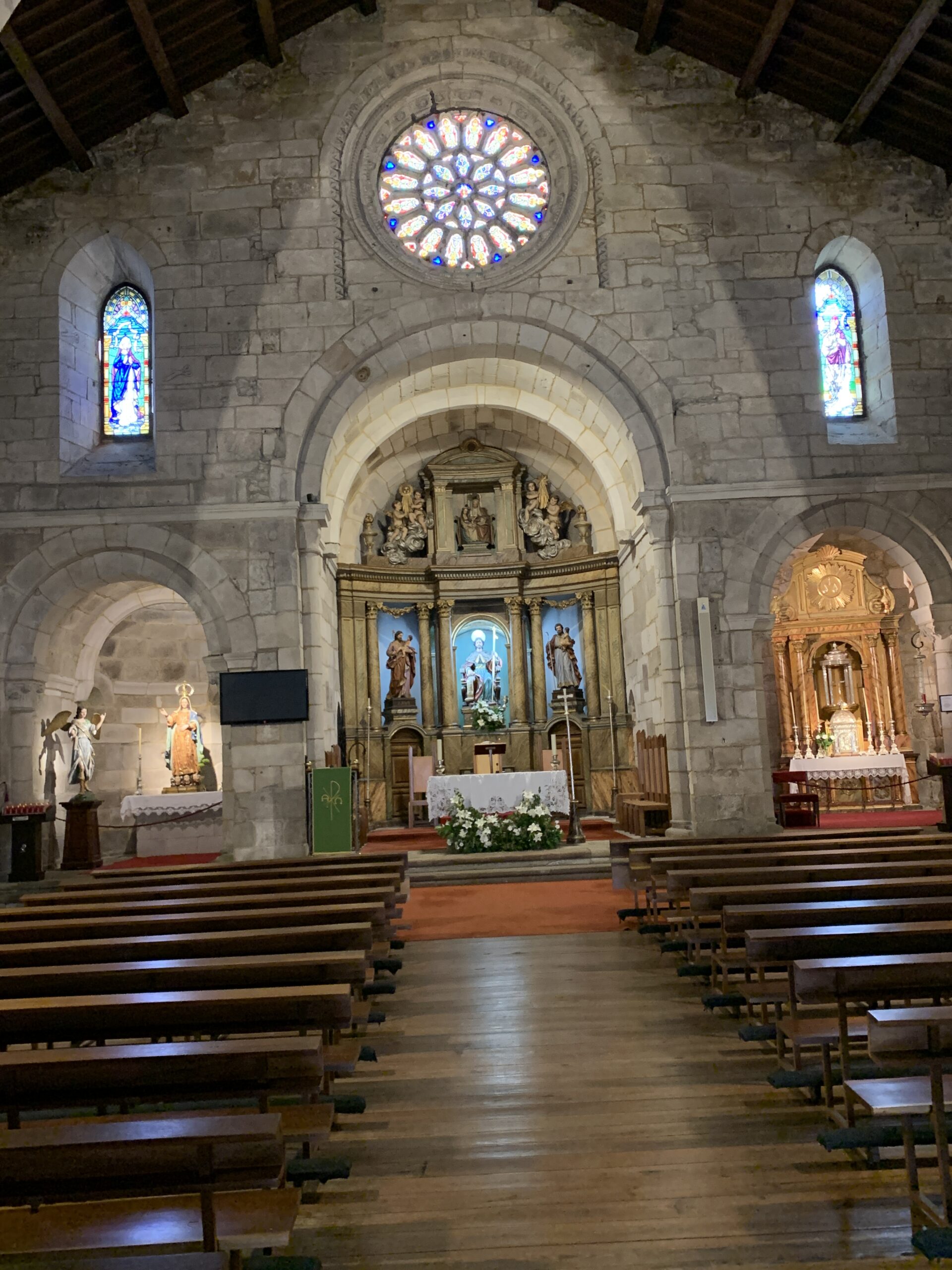 Kurz hinter der Festung begegnete uns wieder ein Hinweis zum Jakobsweg. Selbiger hatte uns schon bei der Anreise nach A Coruña begleitet. Hier im Ort gibt es eine Kirche, die auch Teil des Pilgerweges ist. Es ist die Igrexa de Santiago. Hier durften wir einen Blick hineinwerfen. Es handelt sich um eine Kirche aus dem 12. Jahrhundert, die sehr schlicht gehalten ist.