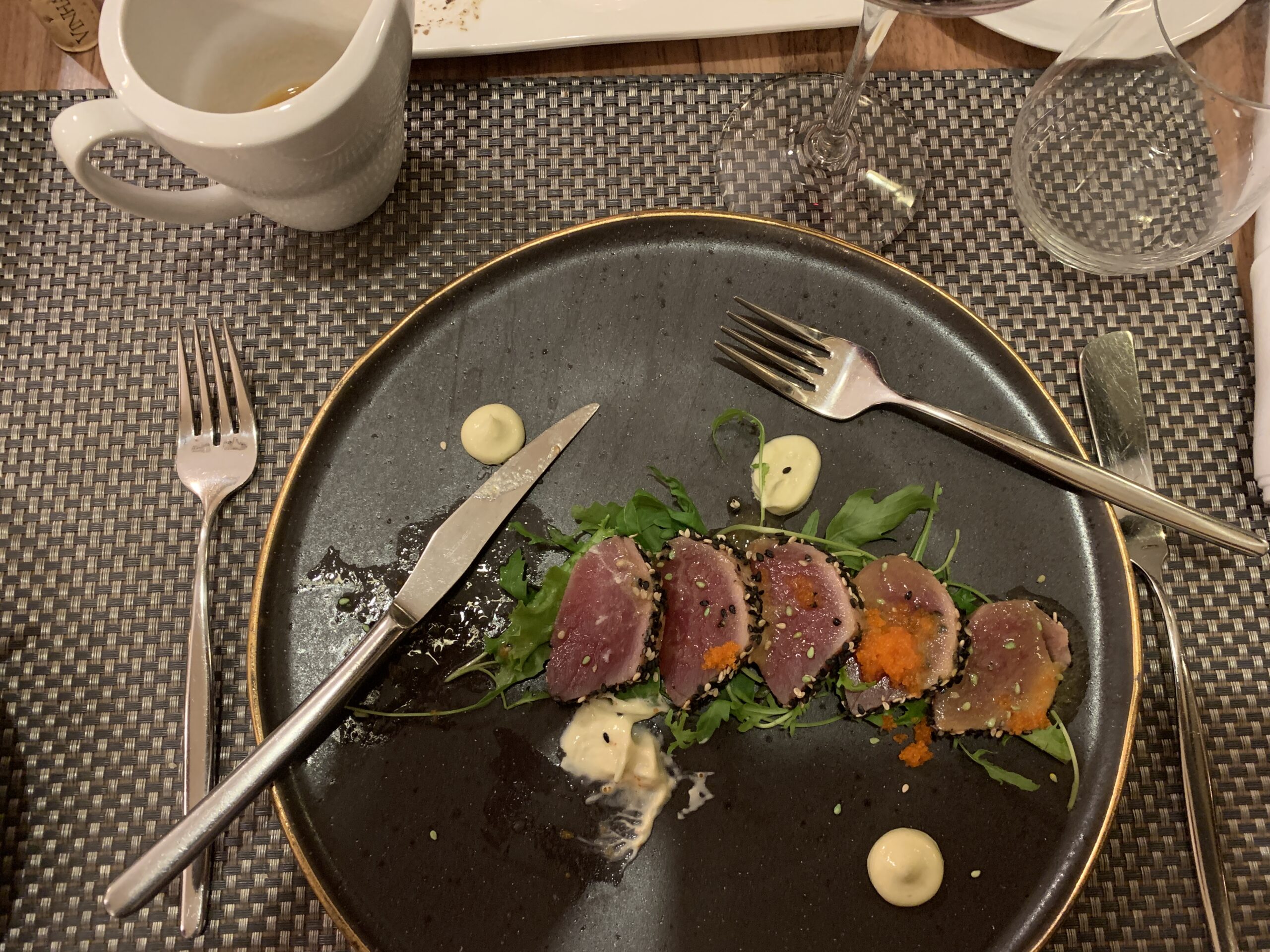Das Abendessen gestern war der Knaller. Wir haben Á la Carte gegessen. Vorweg gab es Thunfisch in Sesamkruste. Als Hauptgericht gab es Wolfsbarsch mit Meeresfrüchterisotto und geschmorte Lende vom schwarzen Ibericoschwein mit Erbsenvariationen. Den Nachtisch stellten Créme Brülée und karamellisierte Ananas. Dazu gab es einen Rotwein der unglaublich lecker und mild war. (Vinha Paz aus der Region DĀO)