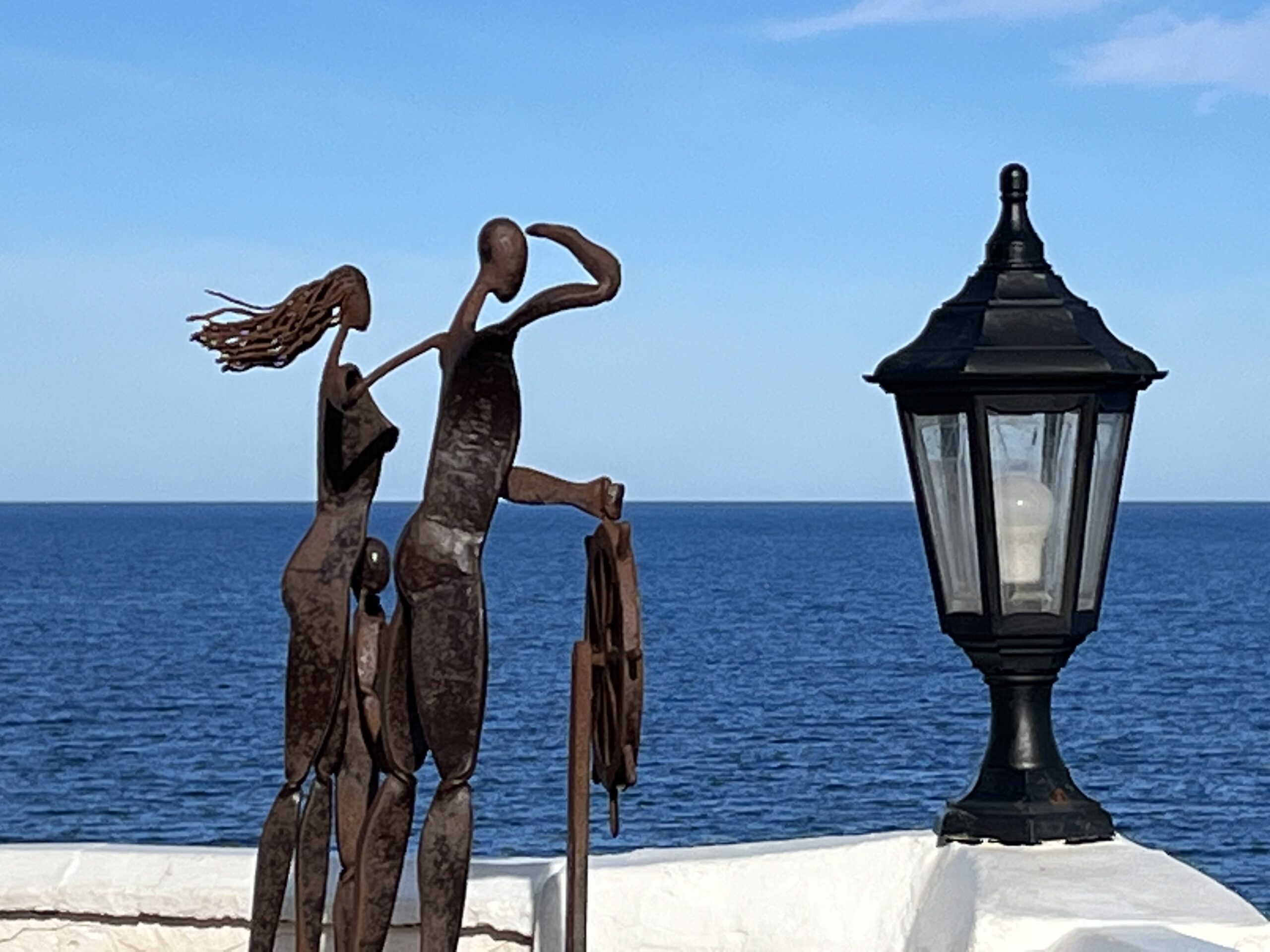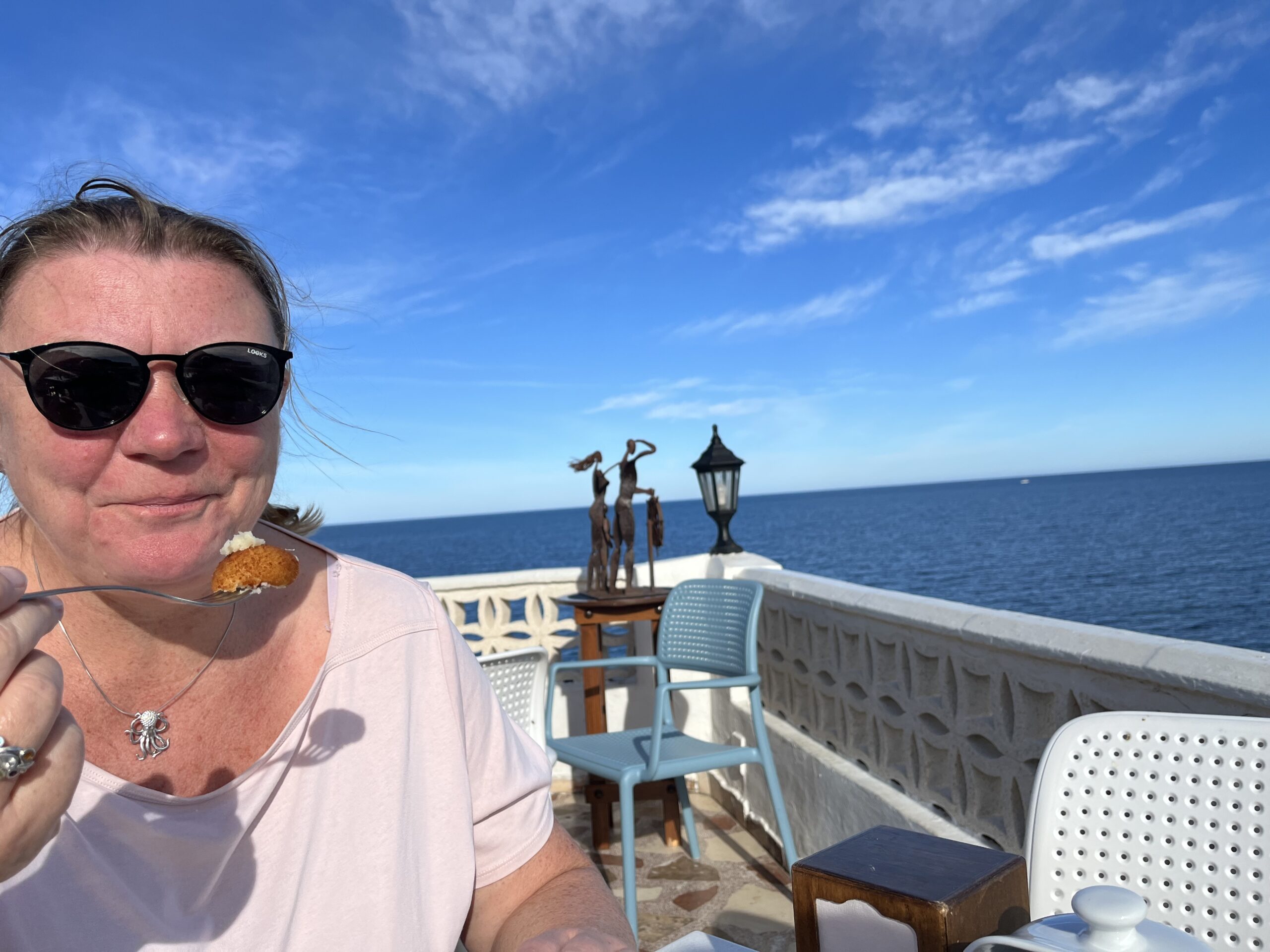 Dort gibt es ein Restaurant und wir beschlossen, erstmal eine Kleinigkeit zu essen. Wir sassen also im T- Shirt auf der Terrasse in der Sonne und genossen unsere Croquetas de Jamon, Muscheln und Tintenfisch.
