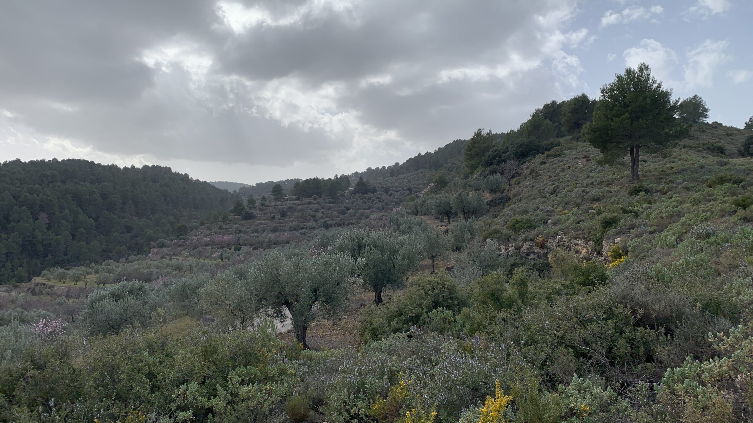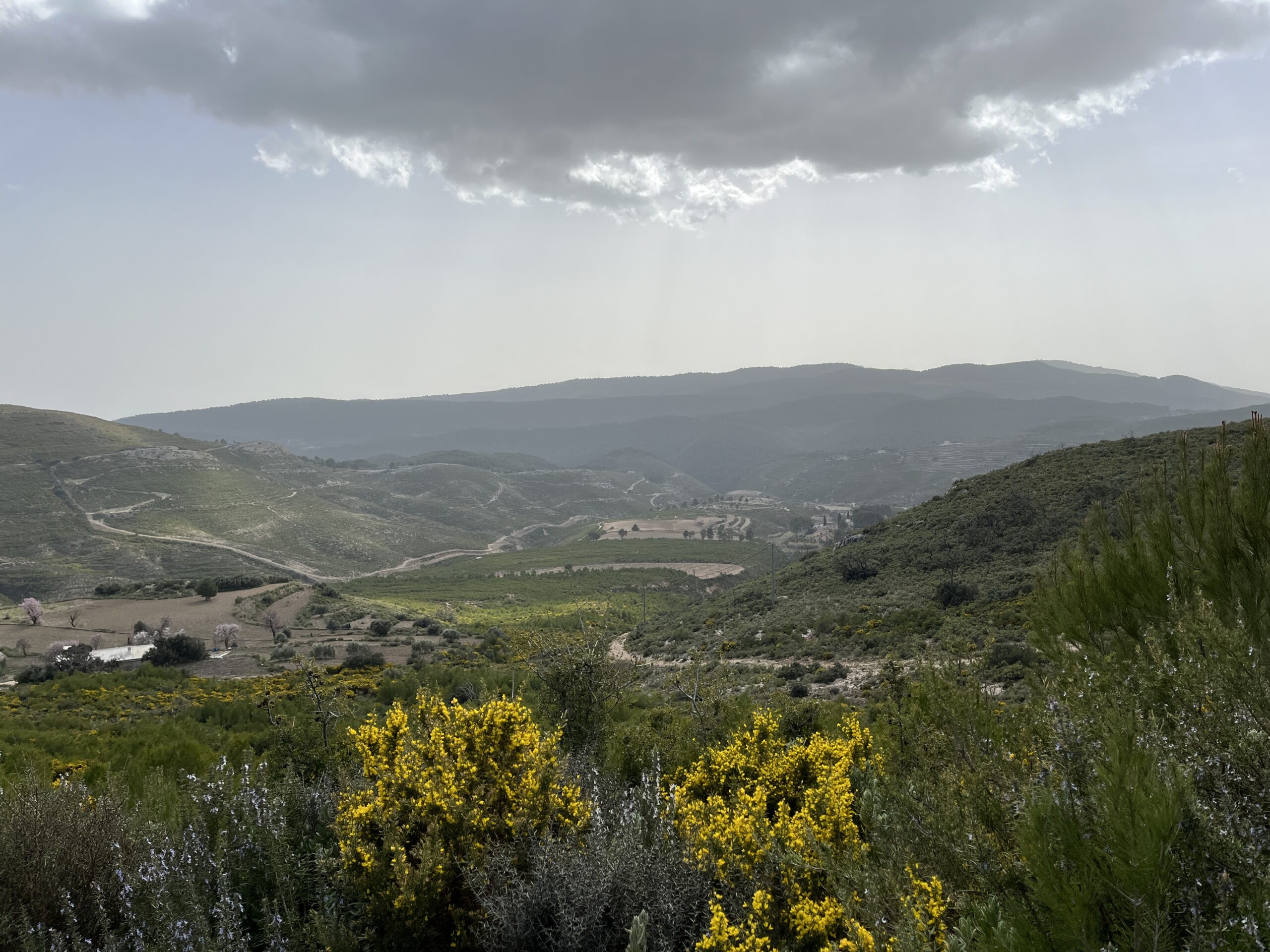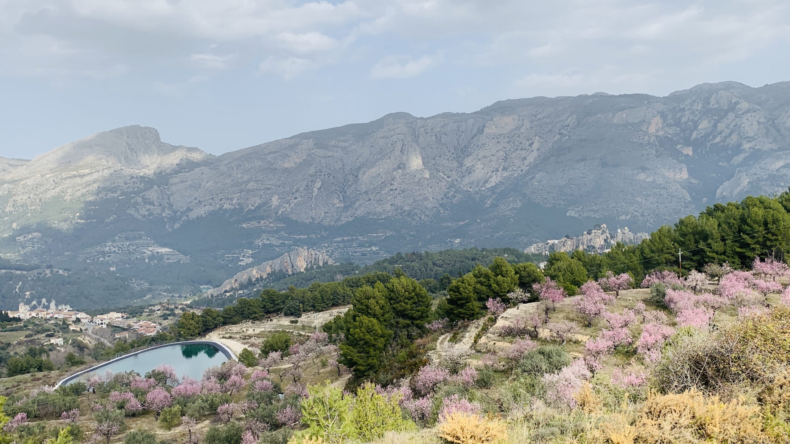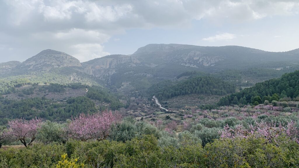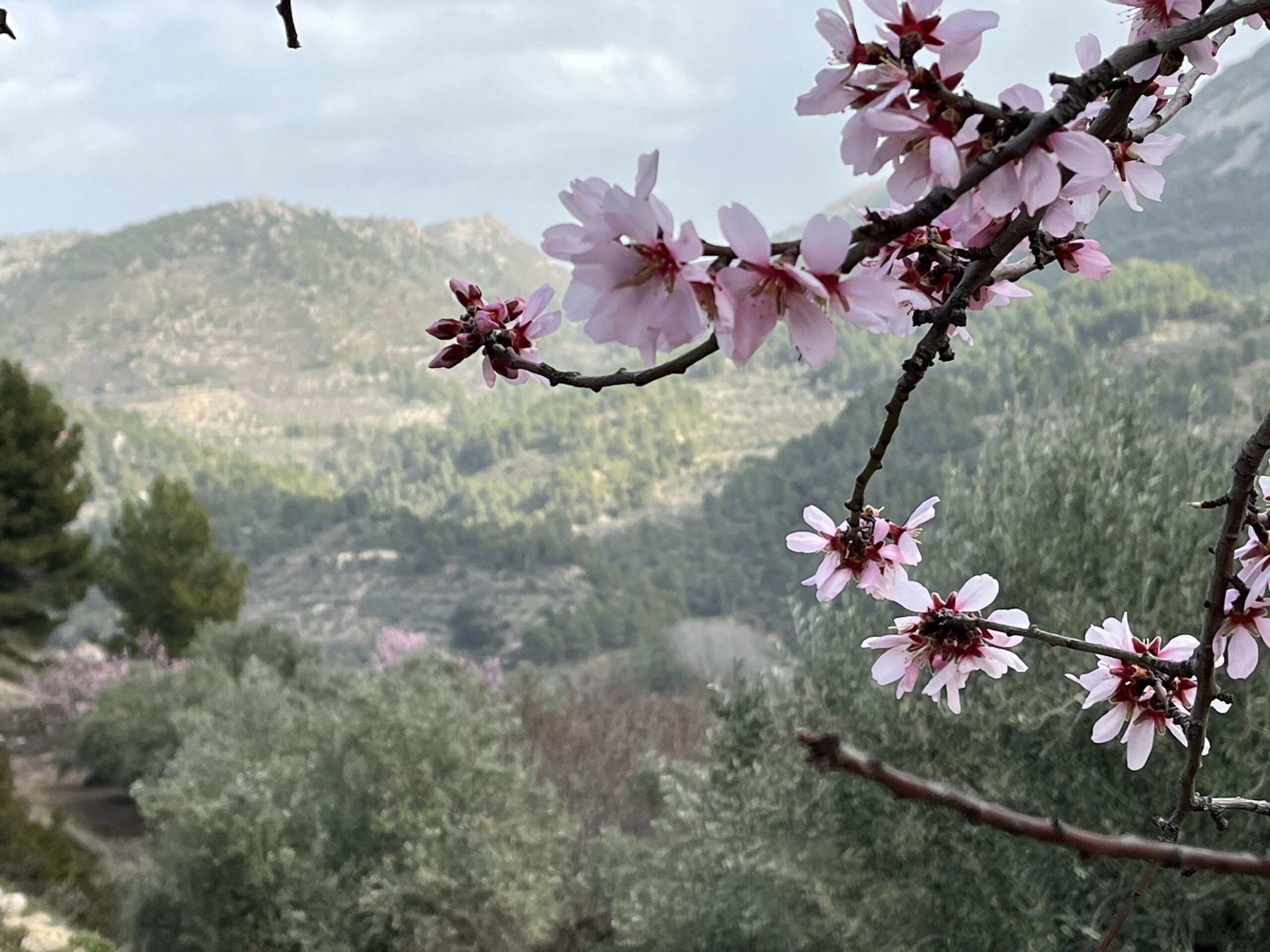 Viele kleine Strassen, die wir bisher nicht kannten, erkundeten wir. Hier in den Bergen, wo es vor Allem nachts noch kühler ist, als an der Küste, stehen die Mandelbäume in voller Blüte. Immer wieder hielten wir an, um Fotos zu machen und den Anblick zu geniessen. An einem recht einsamen Platz hielten wir an und freuten uns über das Farbenspiel. Die Kirschblüten gibt es von weiss bis hellrot. Dazu blüht der Ginster in gelb und der Rosmarin blau. Nimmt man den Helm ab, steigt sofort der aromatische Duft in die Nase und in den Ohren summt es von den vielen Bienen. Herrlich! Sonst hört man nichts! Keinen Laubsauger, kein Auto….. Es ist – bis auf die LAUTEN Insekten- Stille. 😂