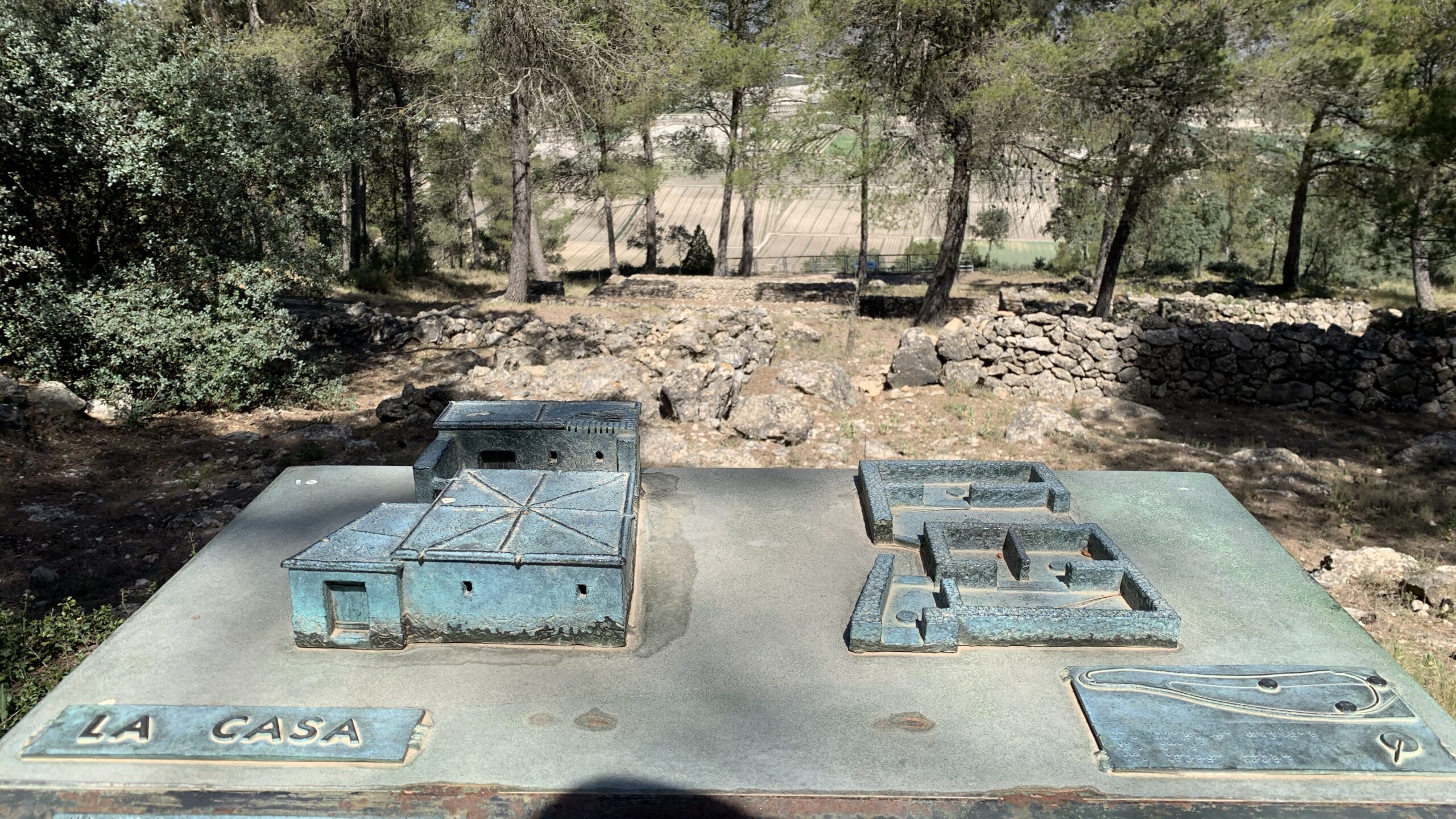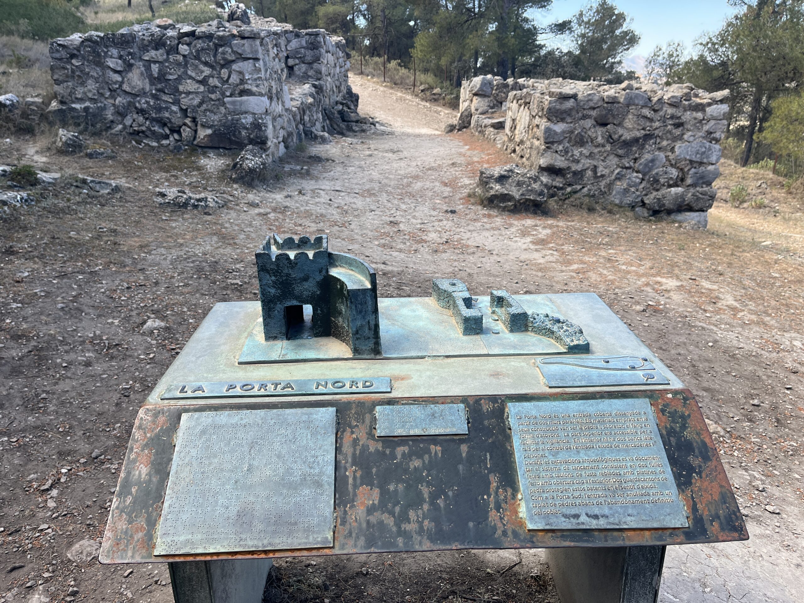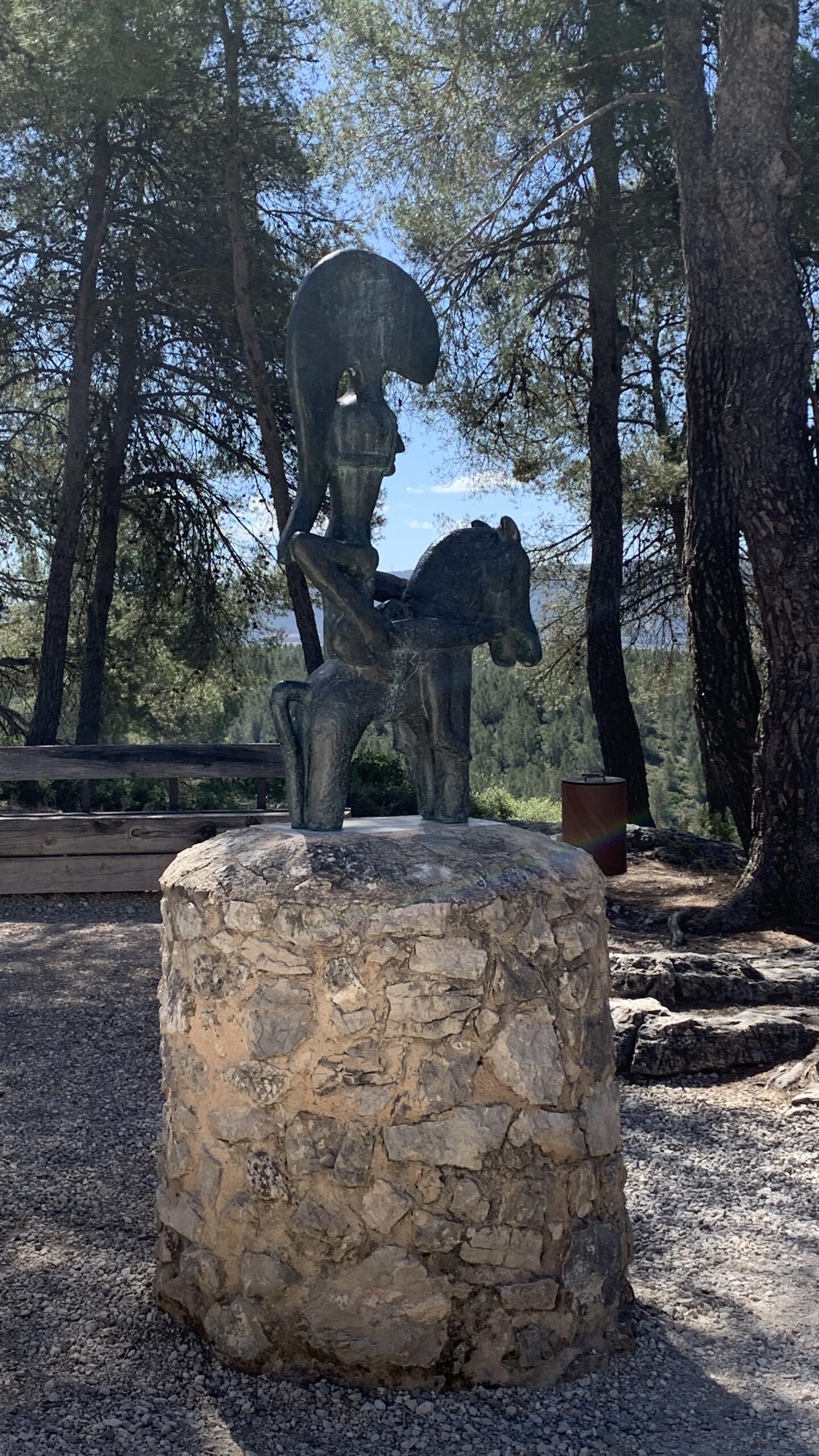 Die Tiger und die BMW fanden einen kostenlosen Platz vor dem Eingang in das 5 Hektar große Areal. Gleich am Anfang wurden wir von dem Wahrzeichen Guerrero de Moixent, einem iberischen Krieger aus Stein begrüßt. Es ist eine übergroße Nachbildung einer 7,3 cm großen Bronzefigur. Sie wurde bei Ausgrabungen, die 1928 begannen, im Ort gefunden.