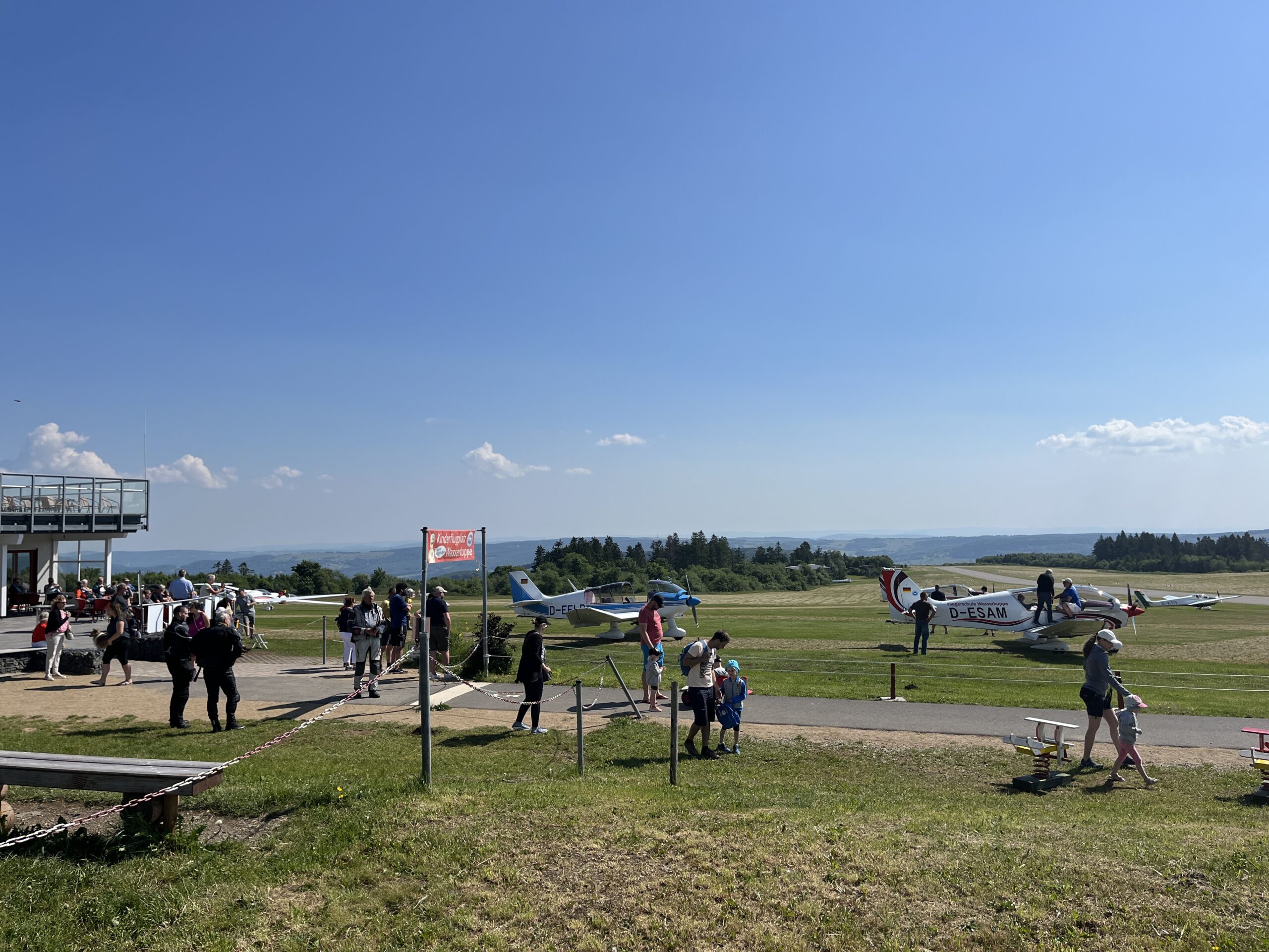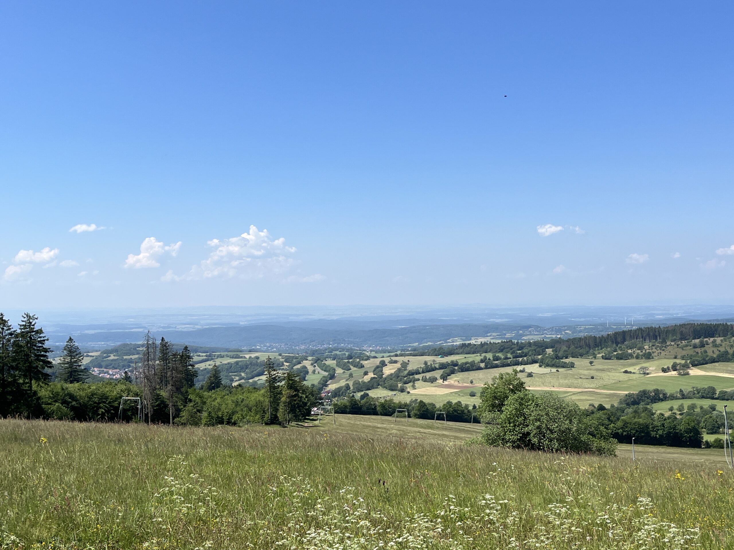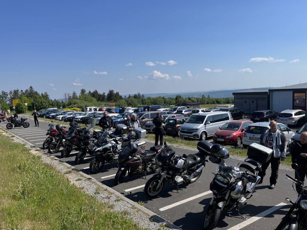 Im Anzug war es die letzten zwei Tage schon recht warm, aber das nimmt man für solche Touren gerne in Kauf. Wie immer war Martin pünktlich vor Ort im Gasthof Sondergeld. An diesem Tag sollte es nun etwas touristischer werden. Da einige aus unserer Gruppe noch nicht auf der Wasserkuppe waren, hatten wir schlossen, nochmal dort hin zu fahren. Auch hier ist die Aussicht immer wieder fantastisch!