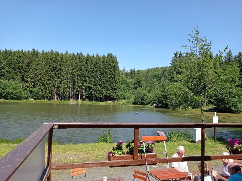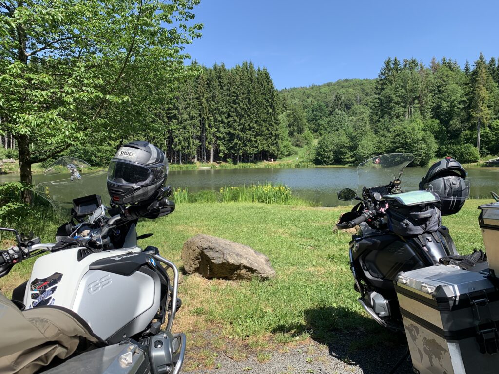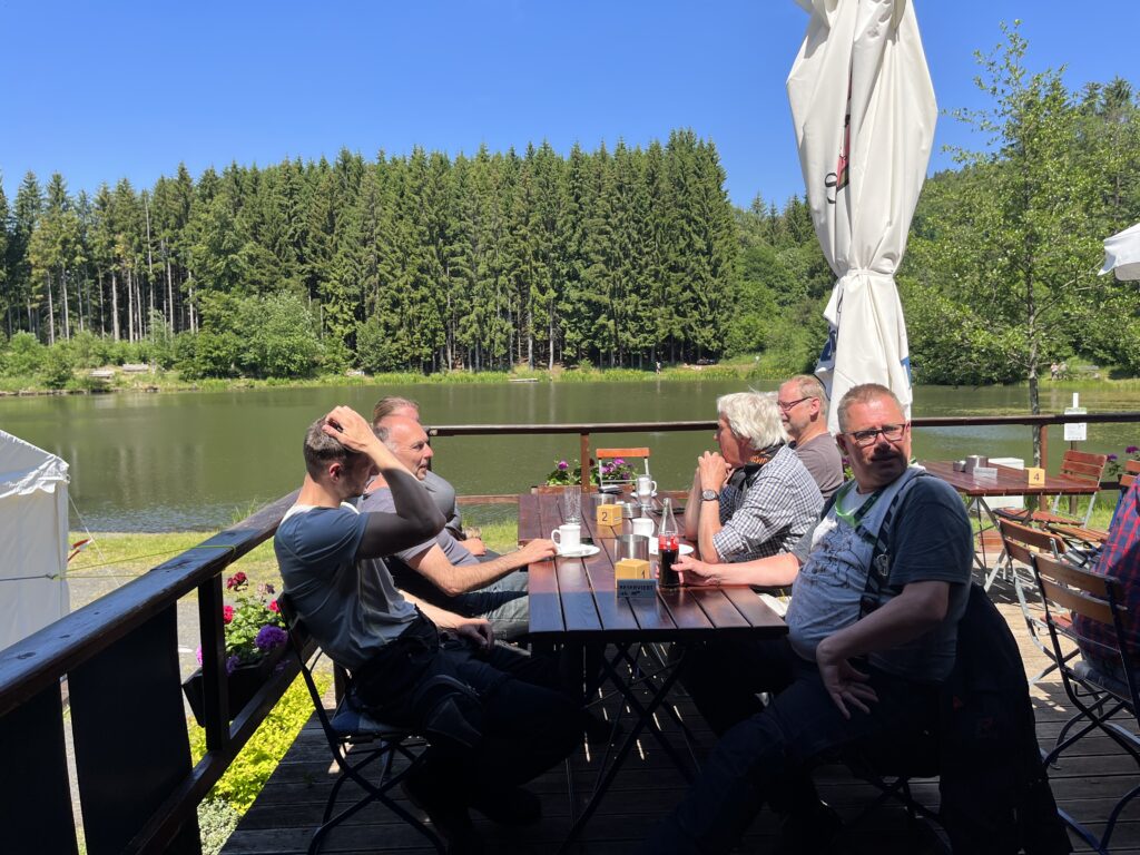 Weiter ging es kurvenreich Richtung Bischofsheim. Hier kennt Martin ein kleines Bistro, das sehr idyllisch an einem See liegt. Natürlich mussten wir die örtlichen Spezialitäten probieren. 😉