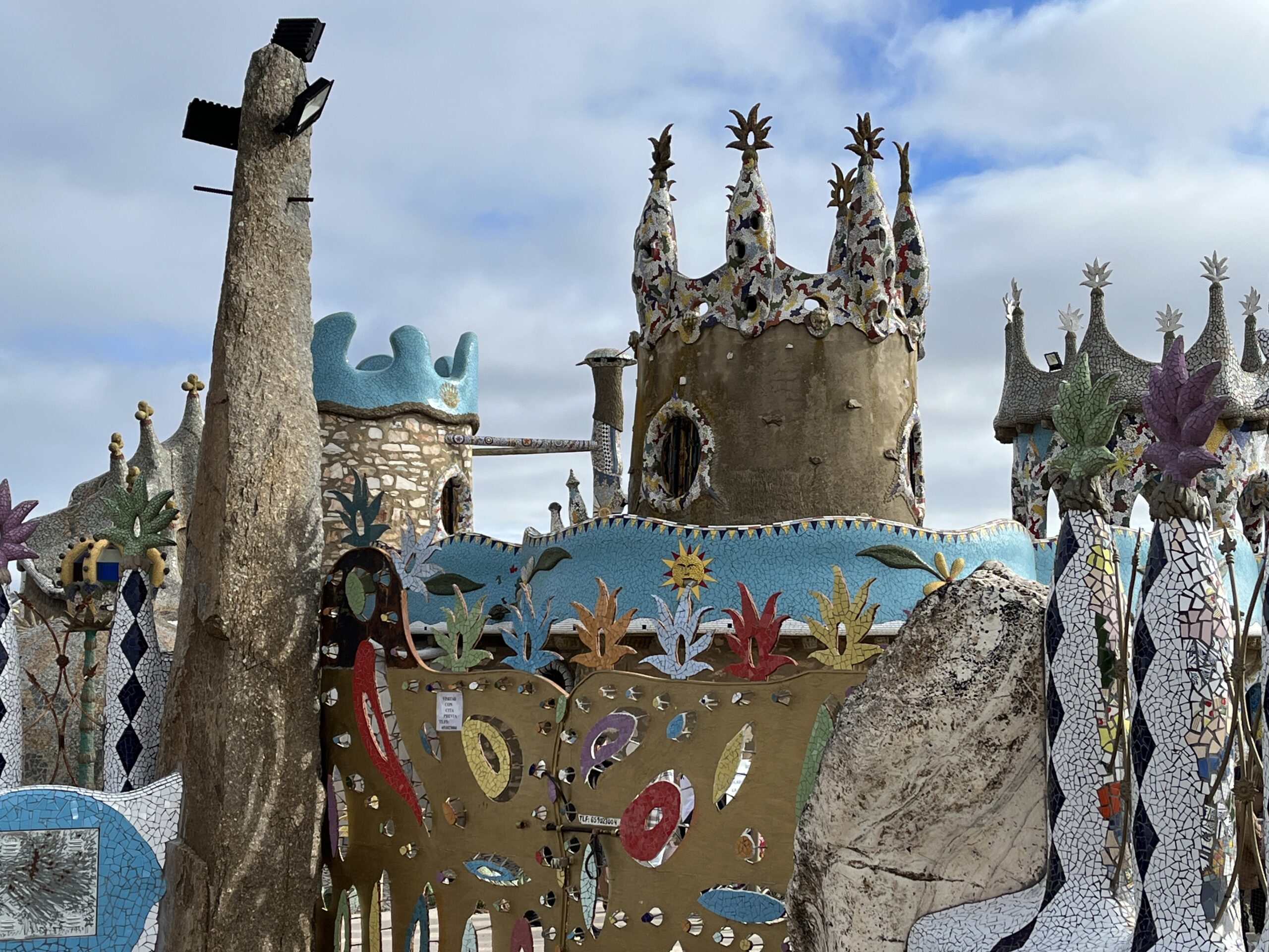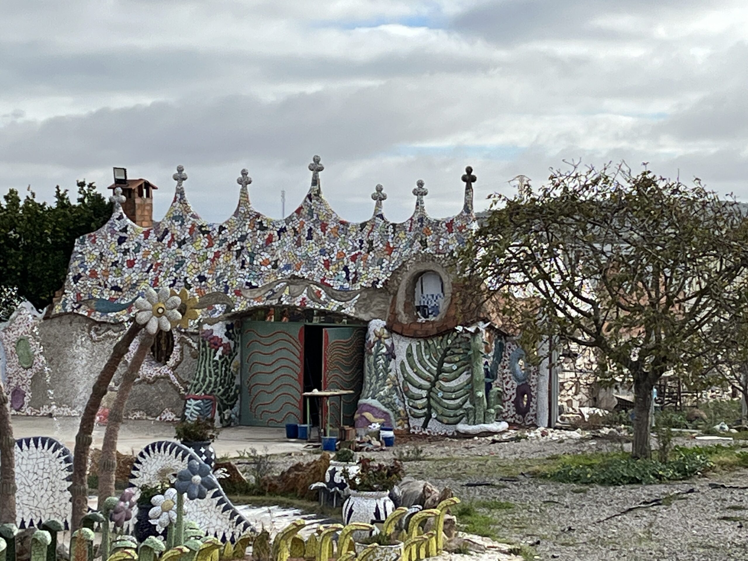 Alles wieder aufgesattelt, fuhren wir Richtung Südosten, über Almendralejo, Villafranca de los Barros nach Los Santos de Maimona. Dort steht ein Haus, dass ein Maurermeister für seine Tochter Cortina erschaffen hat. El Capricho de Cortina ist unbedingt sehenswert! Die Fliesenmosaike sind einfach toll! Bunt, fröhlich und sehr kreativ! Leider haben wir es versäumt, VORHER! telefonisch einen Termin zu vereinbaren., um hinein zu gelangen. Das sollte man machen. So durften wir es “ nur“ von außen bewundern. Es steckt eine über 30 Jahre unglaubliche Arbeit und Liebe darin! Schon auf den ersten Blick sieht man seine Inspiration. Muse war der Künstler Antonio Gaudi.