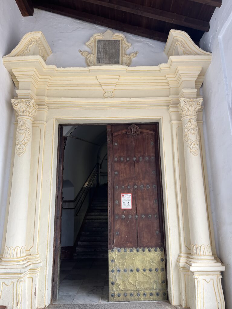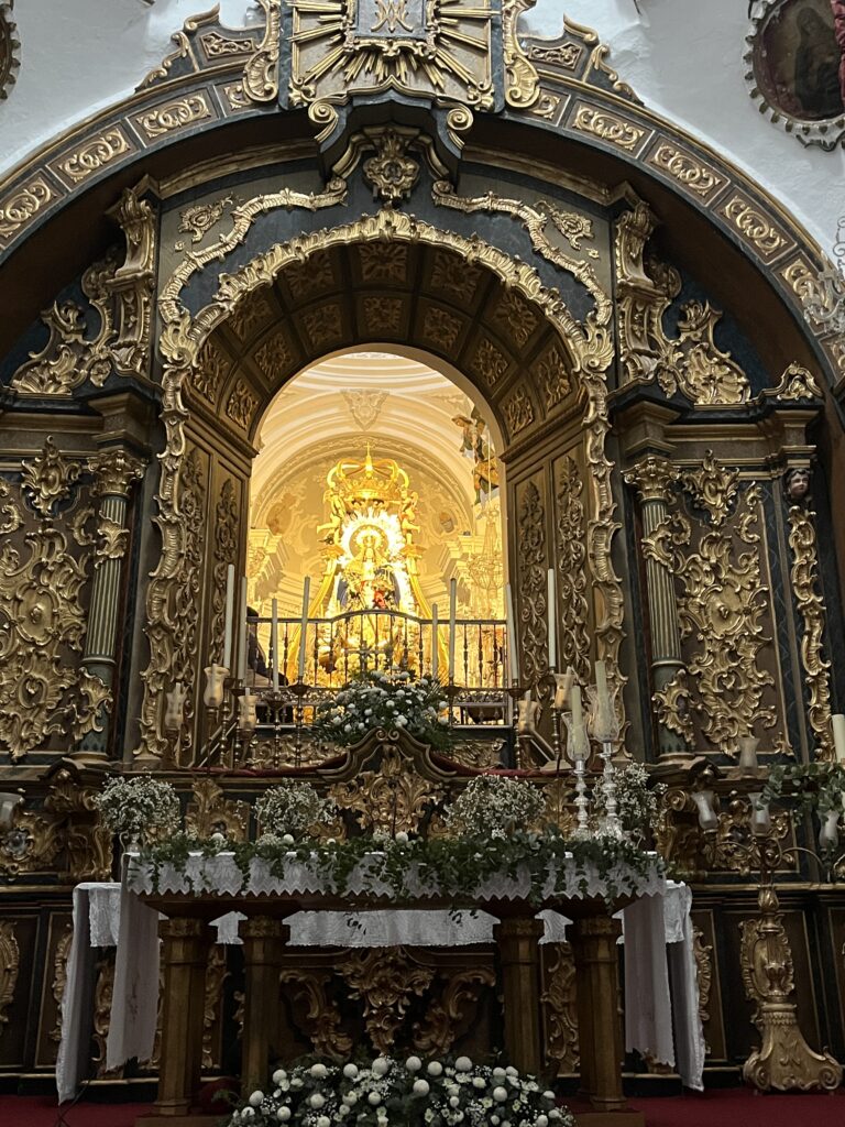 Von hier aus war es nicht mehr weit zu unserem nächsten Ziel. Es gibt eine kleine Kapelle, die der „nuestra señora de los remedios“ geweiht ist. Es ist die Jungfrau der Heilmittel, der im 15. Jahrhundert dieses religiöse, barocke Gebäude gewidmet wurde. Das Besondere daran ist, dass sie -von der Kapelle aus gesehen- Teil des Altar ist. Aber man kann über ein Treppenhaus in den Raum gelangen, in dem sie steht und von der Kapelle aus zu sehen ist. Dort gibt es Bänke zum Verweilen und Beten. Auch gibt es auf dem Areal eine Ausstellung ihrer gestifteten Mäntel. Weitere Informationen findet man hier.