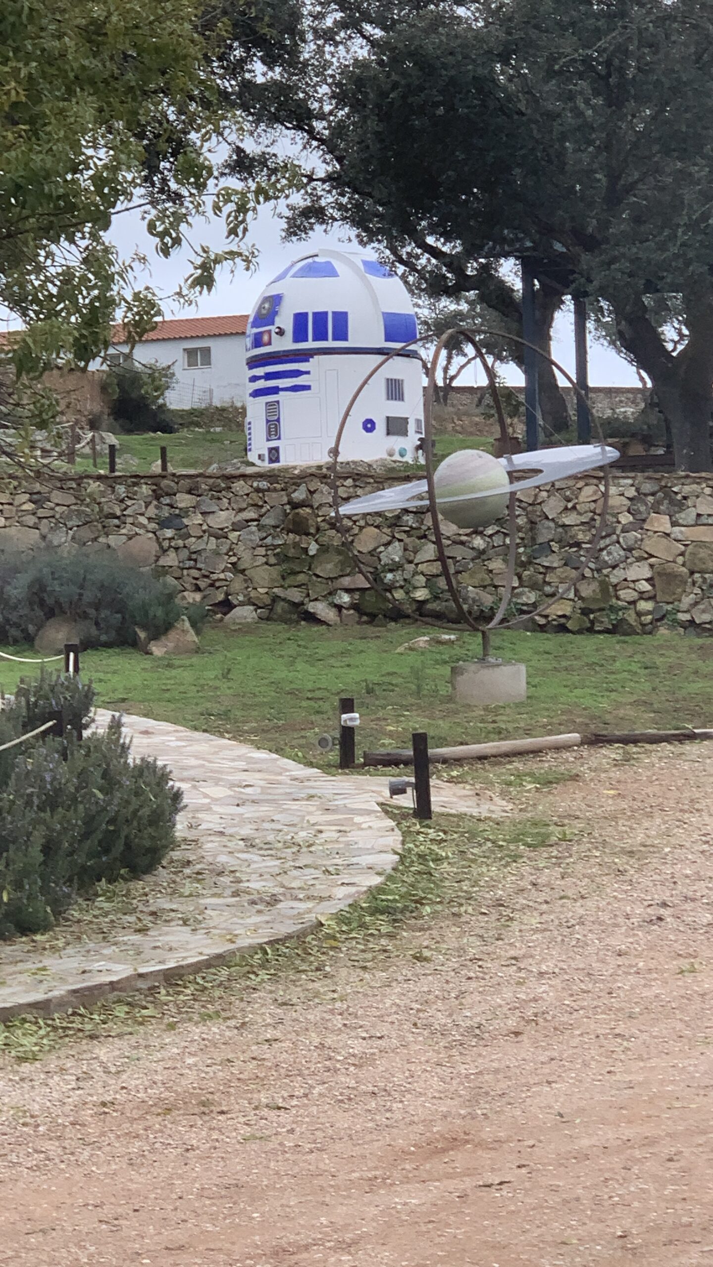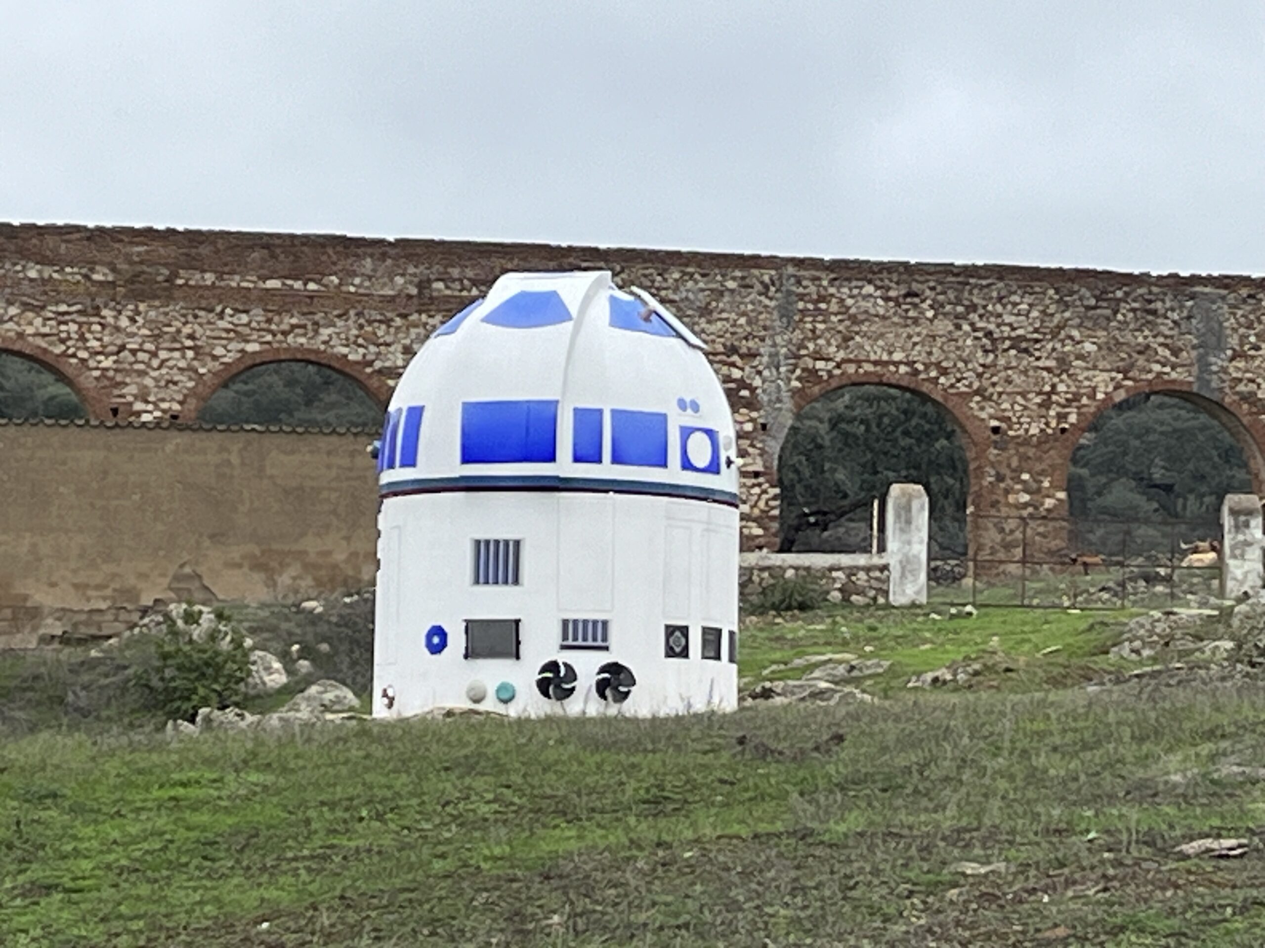 Nur einen Steinwurf entfernt fanden wir die Sternwarte “ Entre Encinas y Estrellas“. Der Weg dorthin war zum Teil keine befestigte Strasse. Wir hatten vor einiger Zeit eine Doku bei Arte gesehen. In „Abenteuer Spanien“ wurde über die o.g. Kirche und die Sternwarte berichtet, die aussieht, wie R2-D2. Natürlich musste wir uns davon überzeugen, wie er in Natura aussieht! 😉