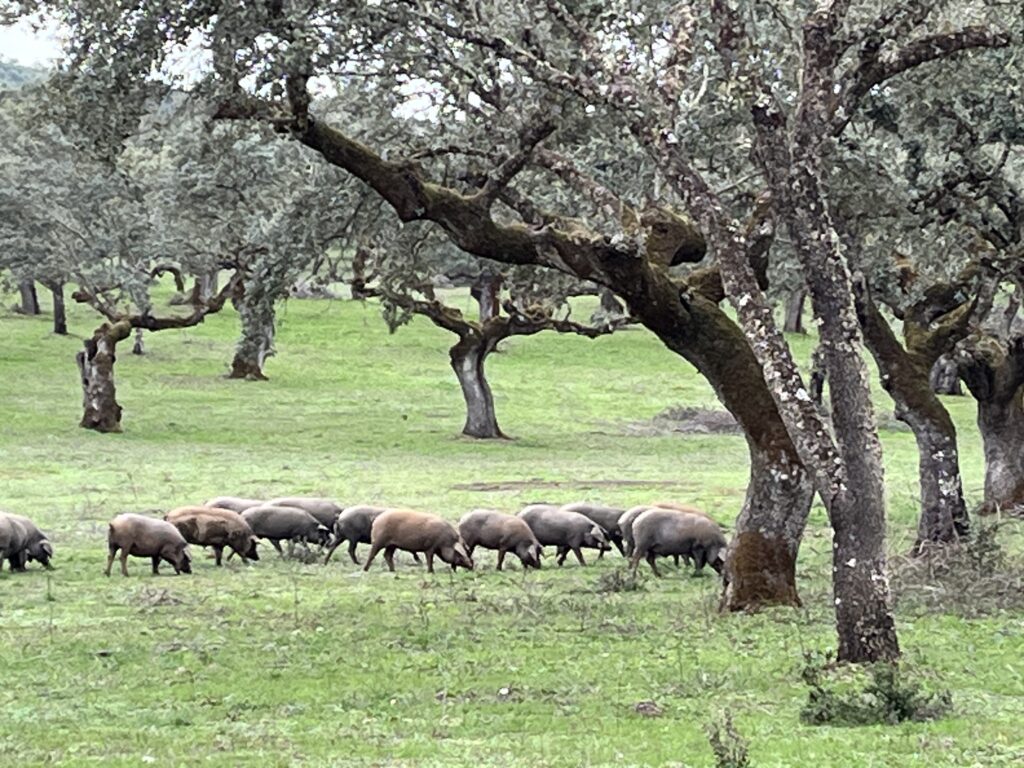 Auf dem Weg zurück nach Badajoz fuhren wir natürlich wieder durch uralte Steineichenfelder, auf denen auch viele Schweine leben. Diese ernähren sich von den reichlich vorhandenen Eicheln. Das und der große Auslauf, macht sie so besonders, denn das Fleisch ist besonders schmackhaft und qualitativ hochwertig. Hier werden sie zu dem bekannten Iberico- Schinken verarbeitet.