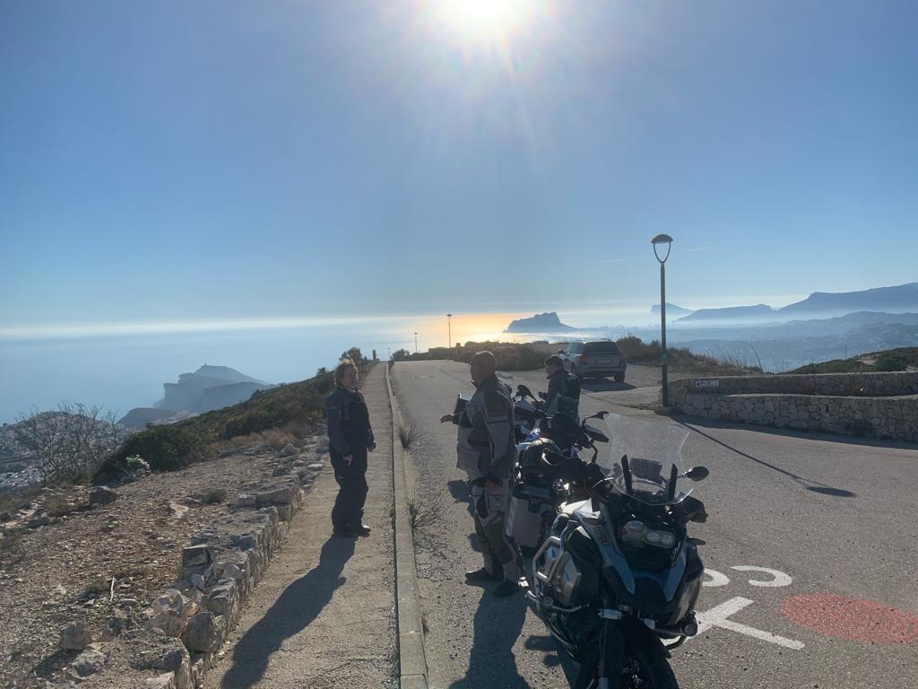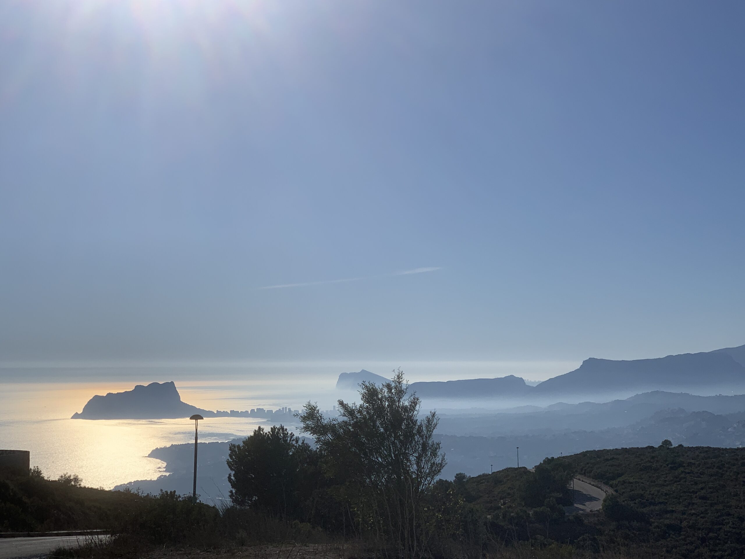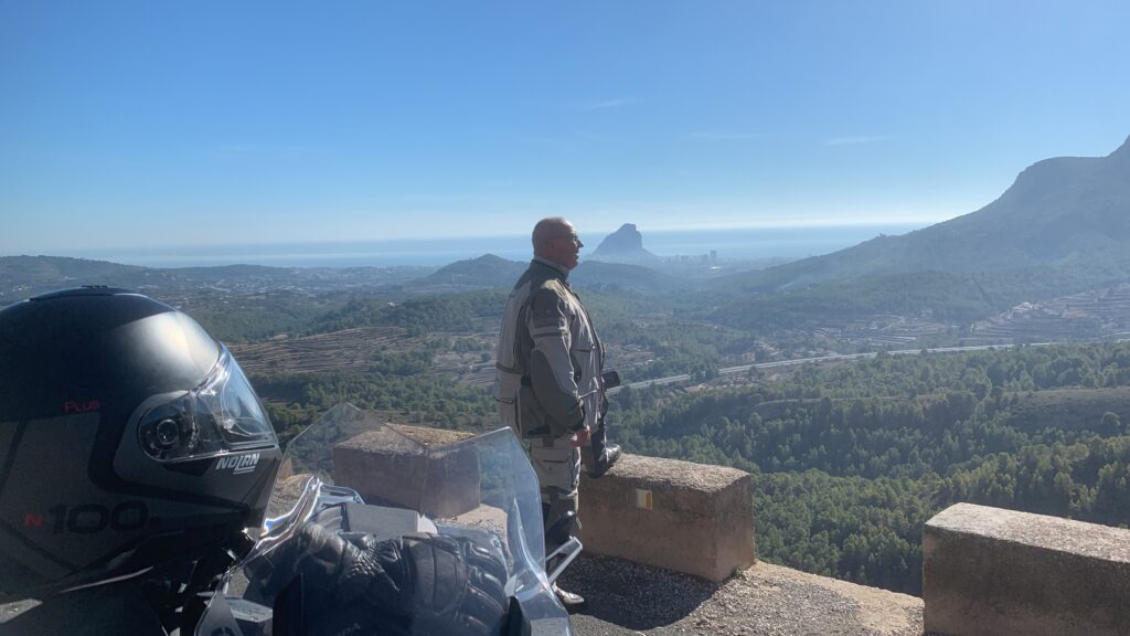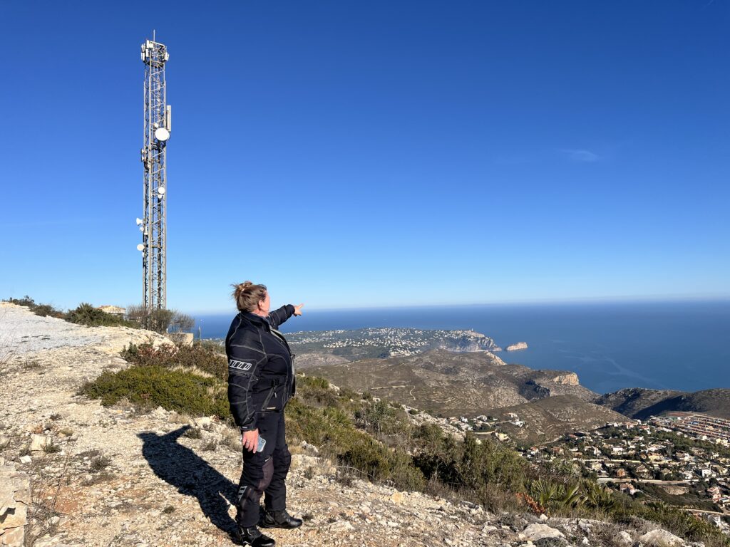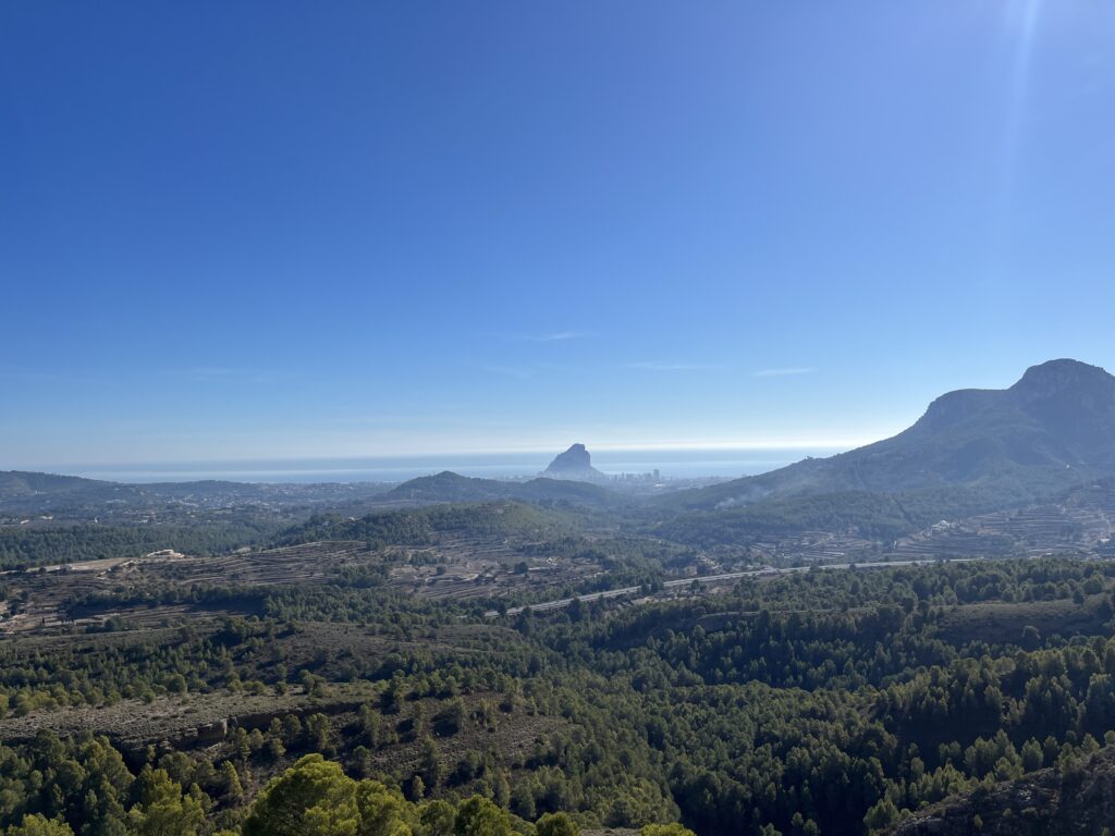 Gut gesättigt fuhren wir die schmale Strasse weiter über den Port de Bernia, hinunter nach Xalo und Lliber nach Benitachell. Mittlerweile hatten wir 23°C, die wir sehr genossen. In Benitachell befindet sich die Auffahrt zum Cumbre del Sol. Der Cumbre ist ein Wohngebiet, das mit vielen Ferienimmobilien für jeden Geldbeutel bebaut ist. Der Gipfel des Cumbre liegt auf 422 m und bietet eine hervorragende Sicht über die umliegenden Orte und Berge und auch auf Ibiza. Das war heute sogar möglich! 👀
