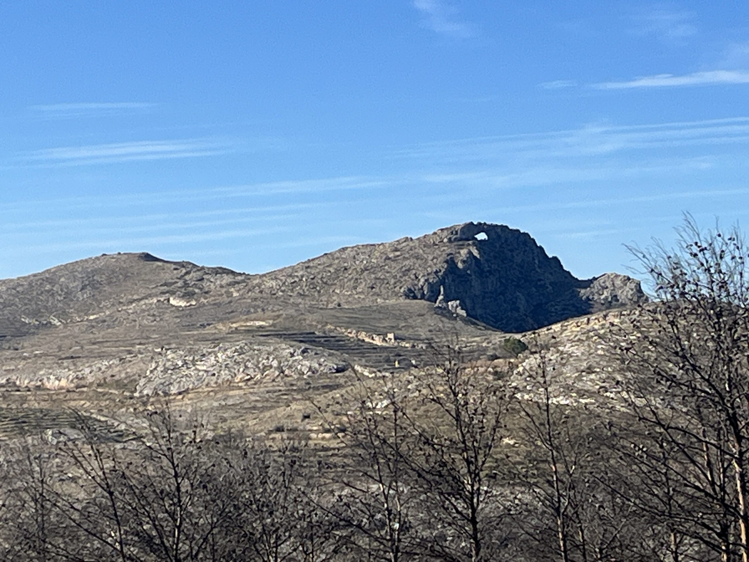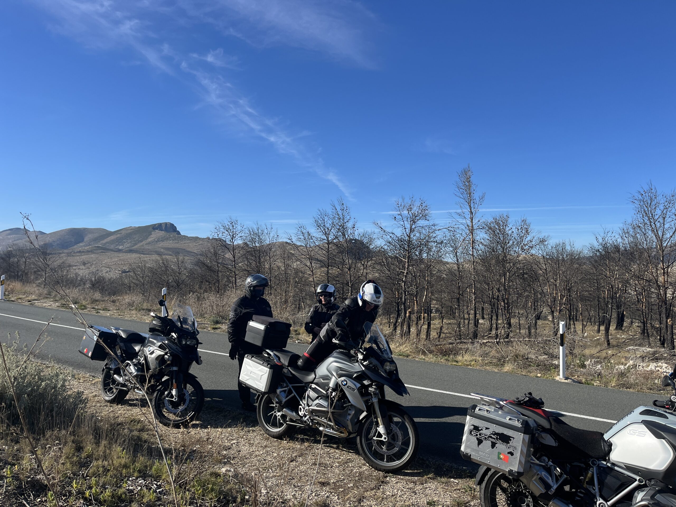 Über Planes fuhren wir weiter über die Hochebene in der Nähe von Vall de Gallinera. Hier hatte es vorletzten Sommer gebrannt. Jetzt sind viele der verbrannten Bäume gefällt und geschreddert. Es liegen aber immer noch überall große Haufen mit aufgestapelten Bäumen, andere Bäume stehen noch verkohlt herum. Jetzt hat man aber absolut freien Blick auf den Felsenbogen Penya Forrada. Wir hatten letztes Jahr bereits über die Brände geschrieben. Wir fahren wir immer sehr gerne durch.