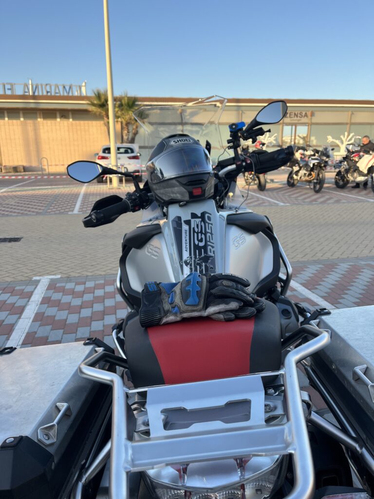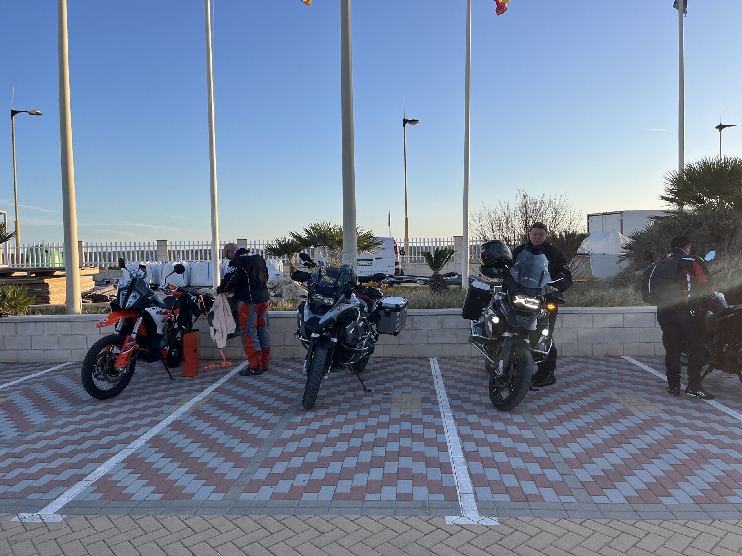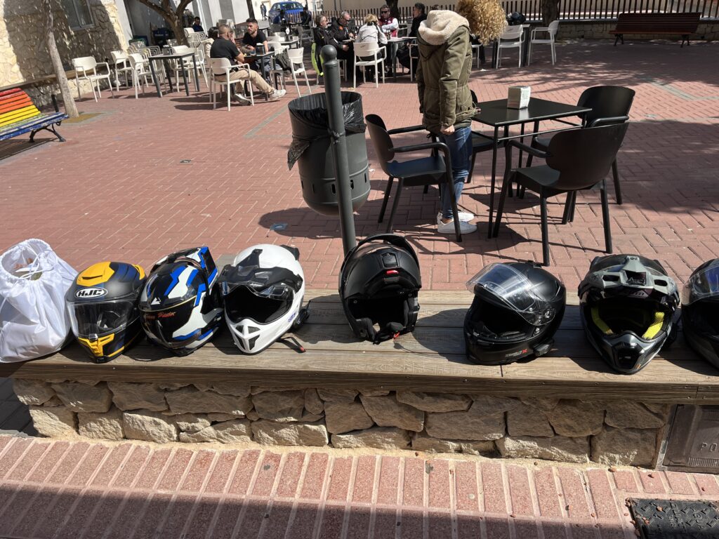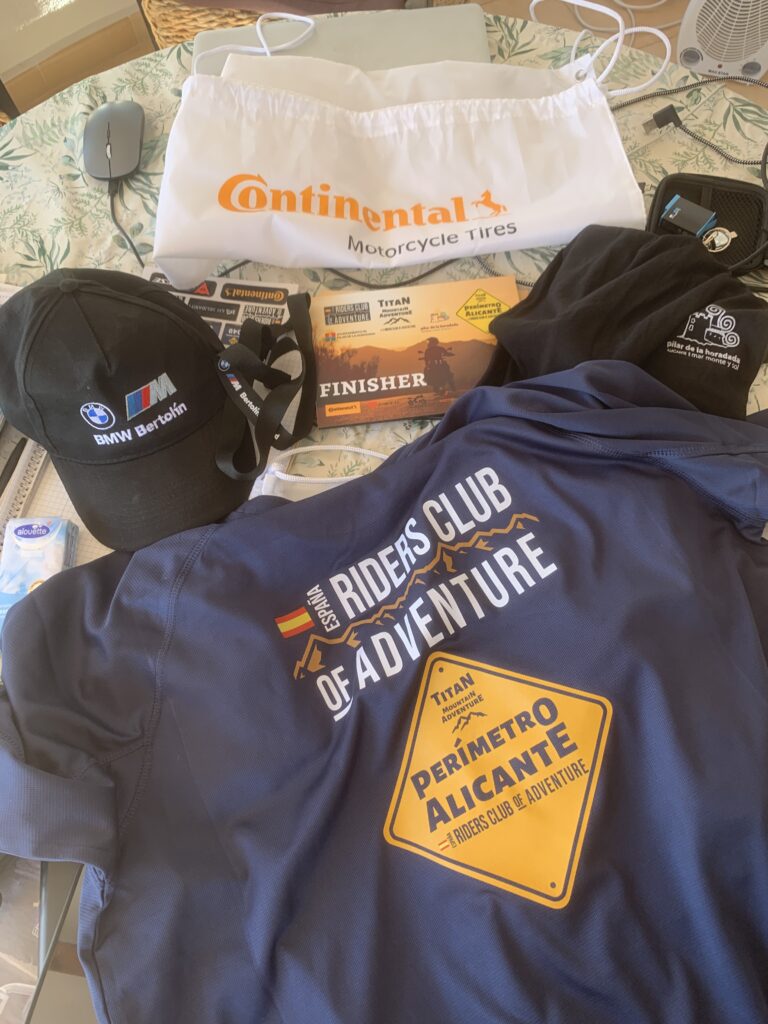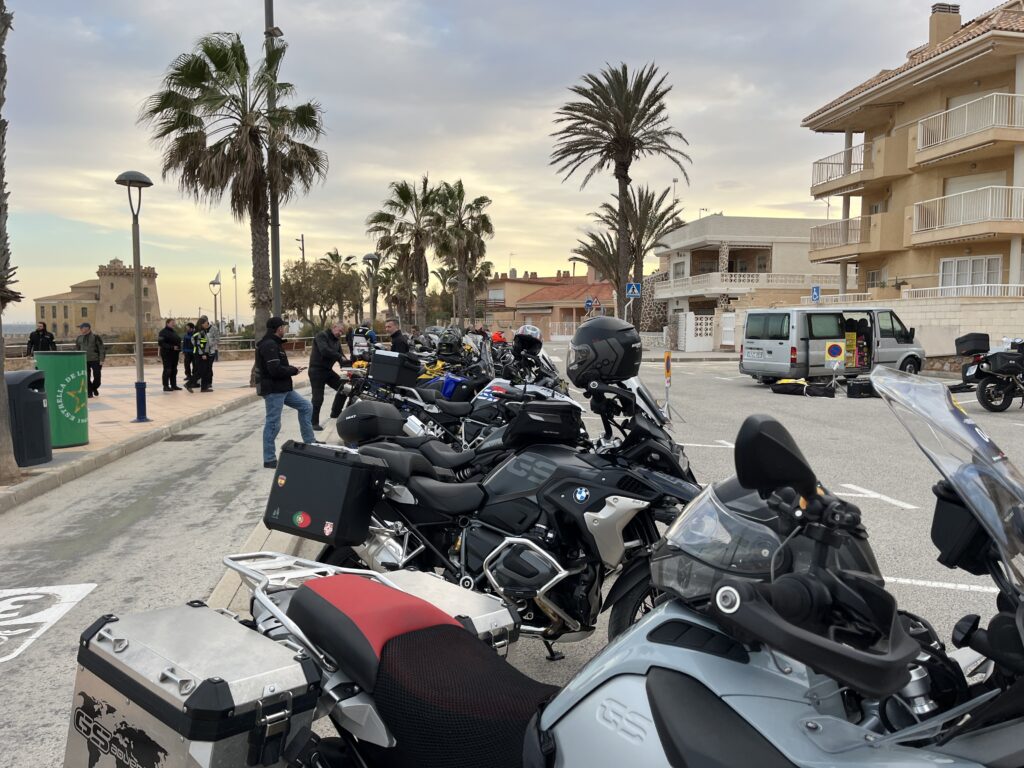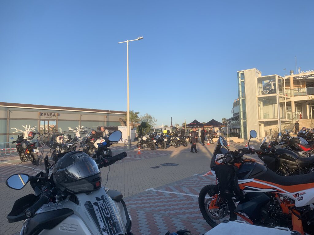 Am Morgen fanden sich über 100 Motorradfahrer im Hafen in Denia ein. Wir bekamen einen Beutel, der Verpflegung, ein T- Shirt, Werbematerial, ein Schlüsselband und einige andere Dinge enthielt. Dazu gab es Aufkleber mit einer Startnummer und eine Stempelkarte, die an bestimmten Punkten der Strecke abgestempelt werden sollten.