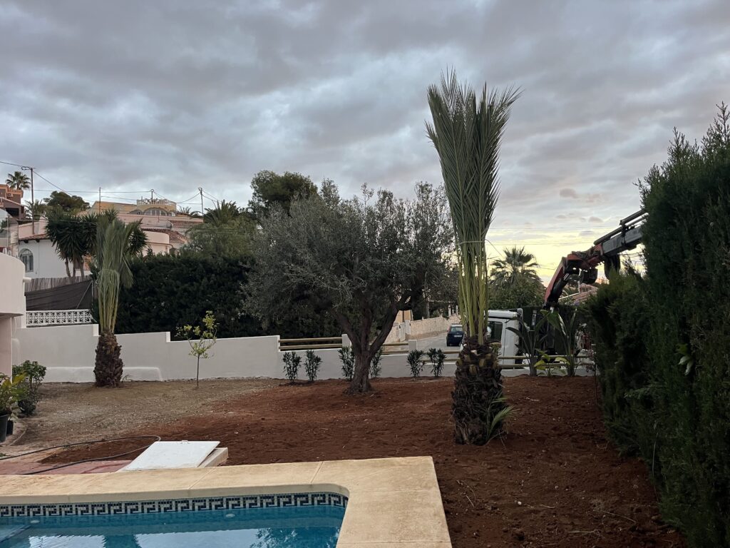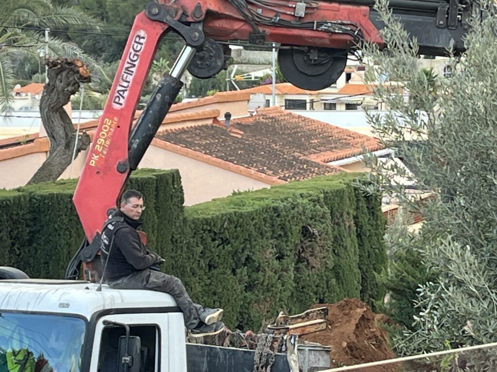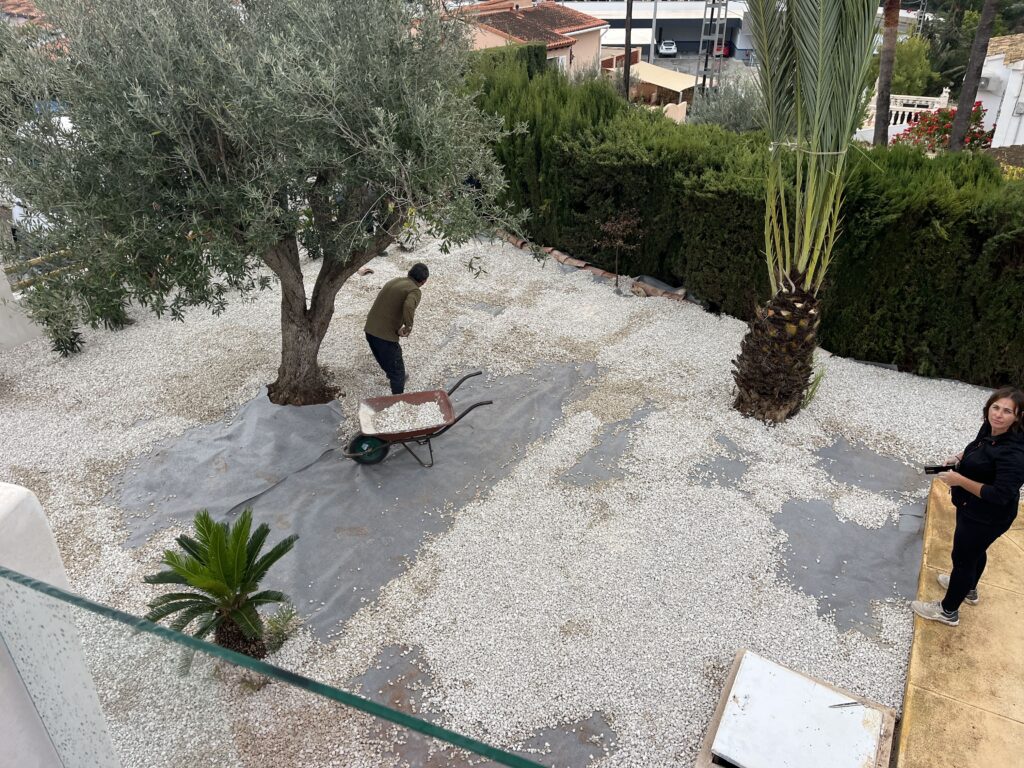 Hier im Haus hatten wir viele Handwerker. Eine Mauer um das Grundstück wurde gebaut und verputzt. Der Elektriker hat das Gästezimmer fertig gemacht und die Aussenbeleuchtung unten installiert. Der Maler hat dann alle sichtbaren Spuren beseitigt. Zur Zeit legen die Gärtner den Garten neu an. Ein LKW brachte viel Erde, die mit einem Teleskopkran in den Garten kam. Sie pflanzen Palmen, Olivenbäume und bewegen viel Erde. Von unserem Balkon haben wir sehr in interessiert zugesehen und natürlich Fotos gemacht. Heute kamen die Kieselsteine und nun sieht alles sehr schön aus.