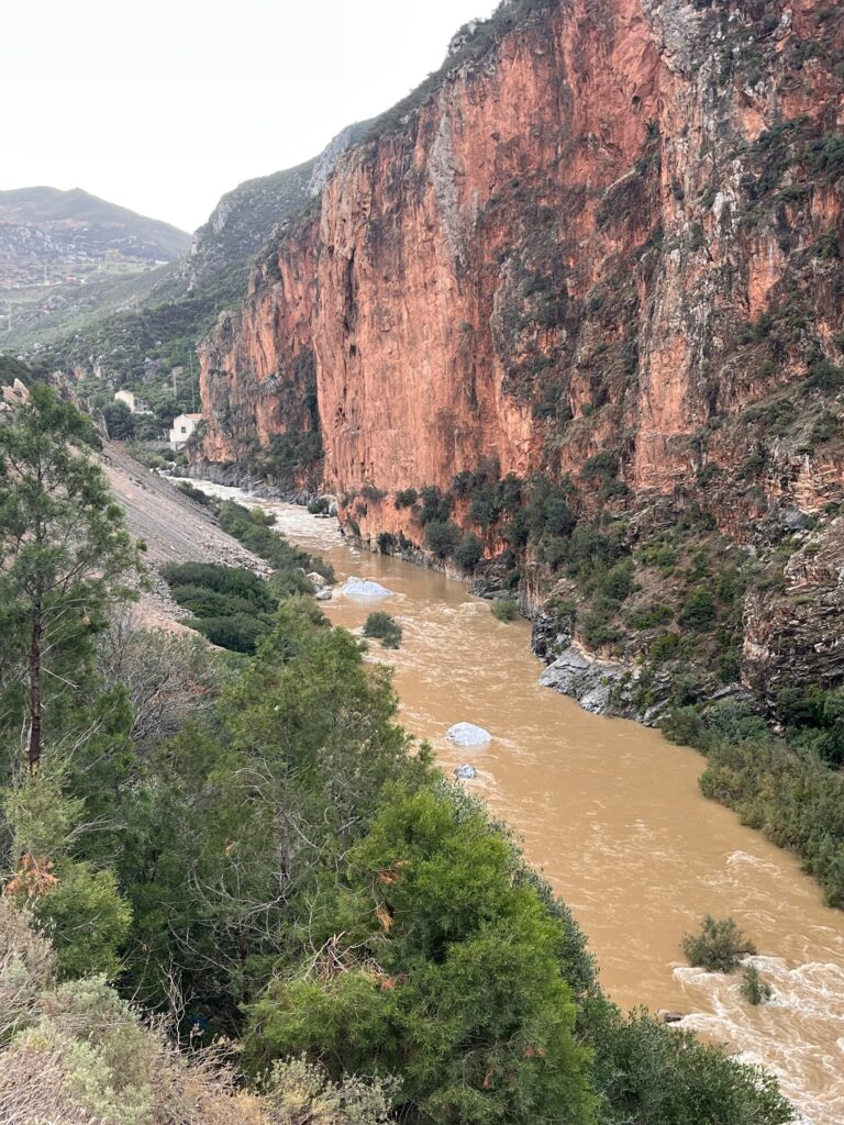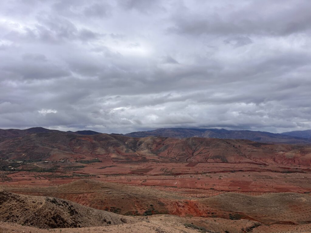 Hinter El Jebha ging es wieder ins Inland. Was für eine tolle Landschaft! Grüne Kiefernwälder wechselten sich mit roter Erde und grün bepflanzten Fäldern ab. Immer wieder tauchte in den Höhenlagen das Meer entfernt am Horizont auf. Die Hänge der Berge hatten verschiedenste Färbungen durch das Wolken- / Schattenspiel am Himmel. Wir hatten Glück, denn das Regengebiet zog hinter uns her. Aber wir waren schneller! 😂